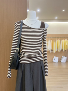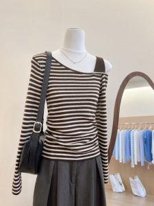 斜领露肩设计感条纹长袖针织女早秋2025新款欧货漂亮收腰上衣百搭