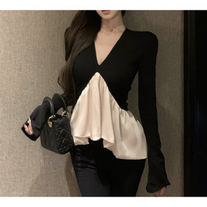 昕可达 桑蚕丝真丝绒!法式轻奢荷叶边拼接V领收腰显瘦长袖小衫