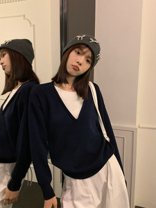 睛雅~藏蓝假两件针织衫女秋季新款宽松高级慵懒韩系毛衣长袖上衣
