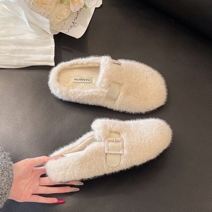 时尚皮带扣毛毛拖鞋女外穿2025年冬新款居家厚底舒适保暖包头拖鞋