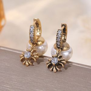 复古珍珠耳环女高级感轻奢潮气质十字花镶钻大气耳饰名媛贝珠耳扣