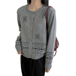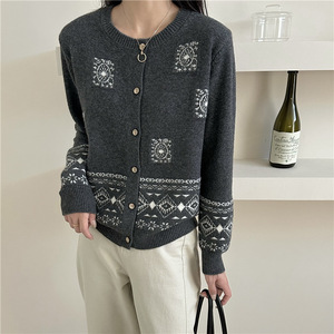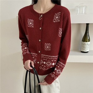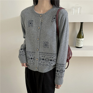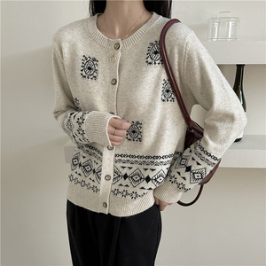 欧洲站秋冬新款针织开衫女洋气时尚复古提花单排扣软糯浣熊绒毛衣