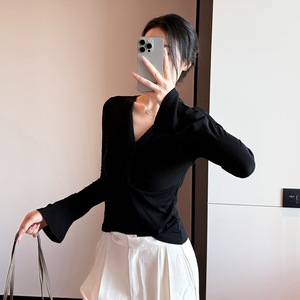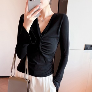 2025年秋季新款扭结V领长袖T恤女褶皱风小衫气质显瘦减龄收腰上衣