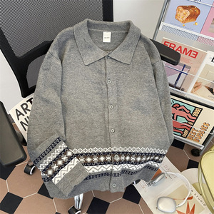 美式提花开衫毛衣男款秋季潮流复古翻领针织衫高级感休闲线衣外套