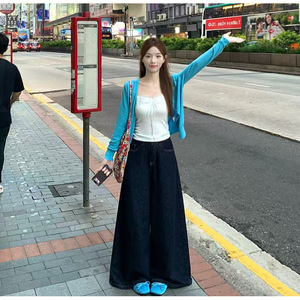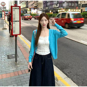 原创V领蓝色花边针织开衫女2025早秋新款小个子修身短款三件套装
