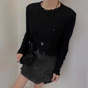 正版秋新款圆领宽松显瘦百搭木耳边长袖T恤打底衫上衣女