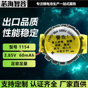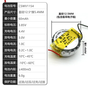聚合物锂电池纽扣式1154 600mah 0.231wh3.85V蓝牙耳机助听软包充