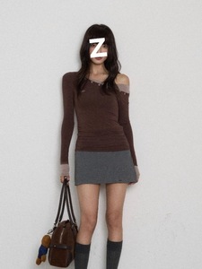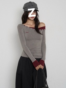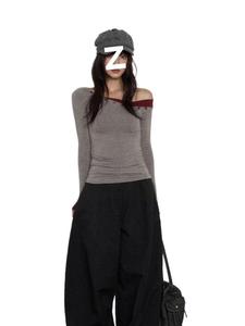 美式纯欲一字肩拼色斜肩长袖t恤女早秋辣妹风修身绝美露肩上衣潮