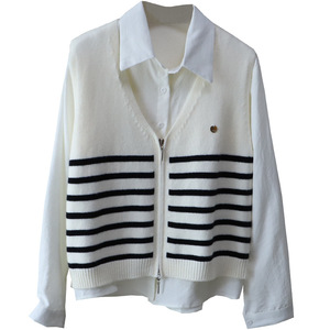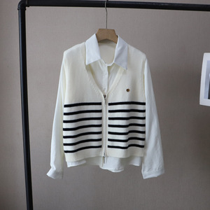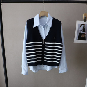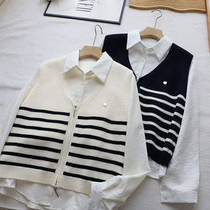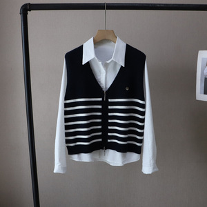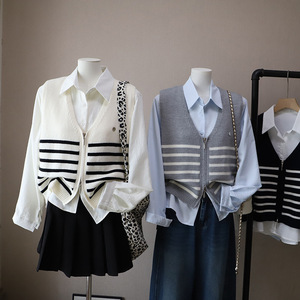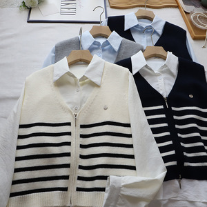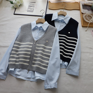 [比正]2025秋季新韩版时尚减龄衬衫外搭双拉链条纹针织马甲女5112