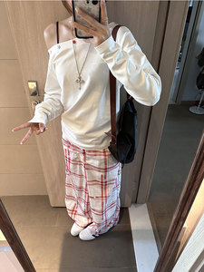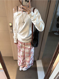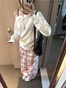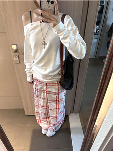 白色斜肩长袖T恤女早秋季设计感露肩纯欲气质慵懒风收腰显瘦上衣