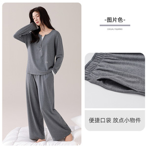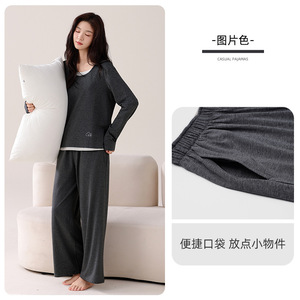 带胸垫睡衣女春秋季莫代尔薄款长袖新款休闲假两件套头家居服套装