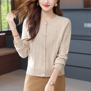 【厂家直供】春秋新款纯色提花圆领开衫毛衣女时尚外套减龄针织衫