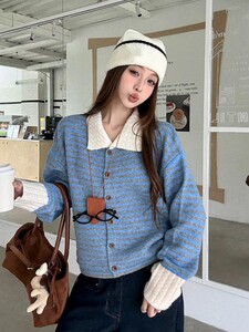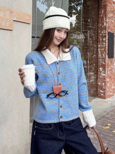 韩系复古撞色条纹翻领毛衣外套女秋季设计感磨毛针织开衫宽松上衣