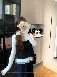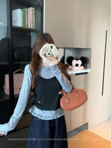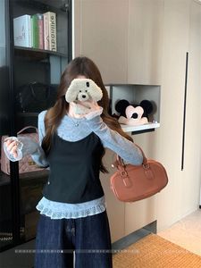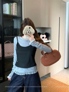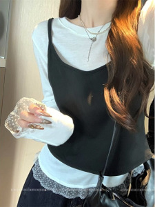 韩系蕾丝花边纯色长袖t恤女秋季甜美叠穿吊带背心修身上衣两件套