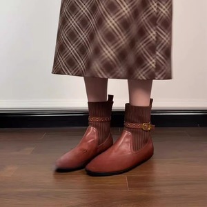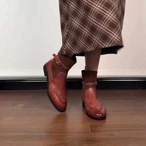 羊皮版~2025年新款法式时尚小众圆头粗跟短筒套筒皮带扣时装靴女
