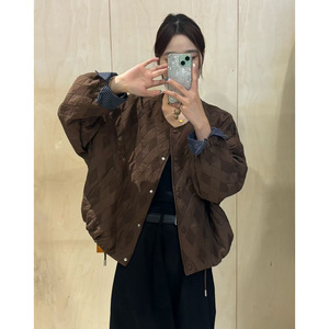 格子拼接袖口菱形格棉衣短外套女2025秋季新款宽松显瘦棒球服夹克