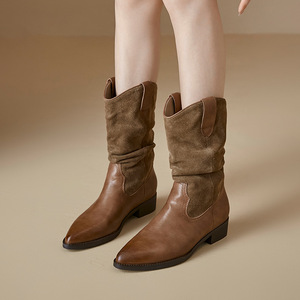 牛皮版~真皮v口尖头法式小短靴女春秋单靴复古西部牛仔靴子马丁靴