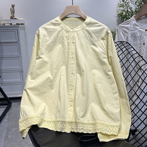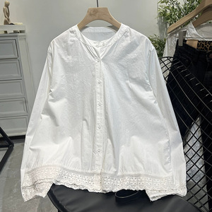 ins风下摆拼接蕾丝边棉质白衬衫女宽松百搭长袖立领衬衣女上衣潮