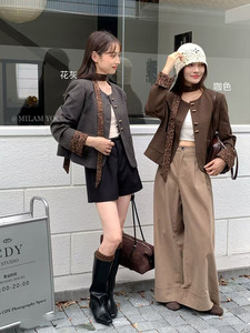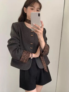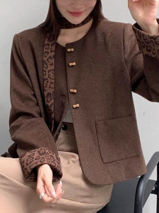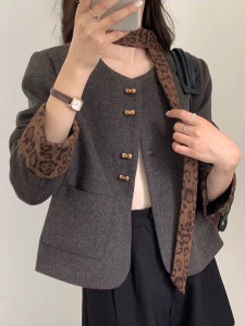 豹纹飘带圆领小香风外套女2025年秋季新款韩版宽松显瘦毛呢上衣潮