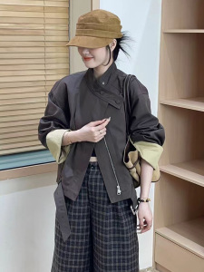 韩版时尚立领袖口拼接拉链短外套女2025秋新款设计感百搭夹克上衣