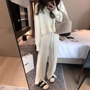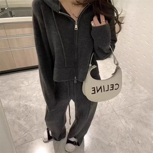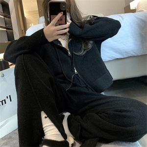 运动风连帽拉链针织套装女秋冬新款短款毛衣高腰开叉阔腿裤两件套