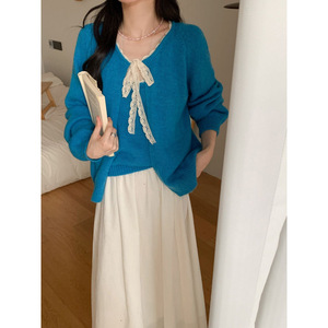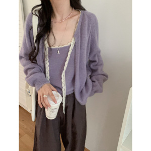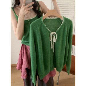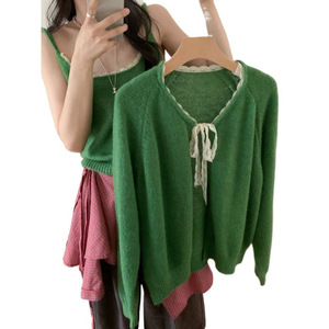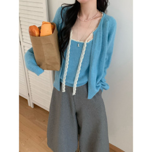 韩系两件套清新甜美温柔减龄蕾丝花边领针织吊带背心毛衣开衫套装