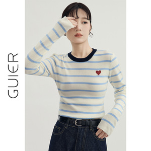 「GUIER」撞色条纹针织衫女春秋2025新款设计感爱心刺绣修身上衣