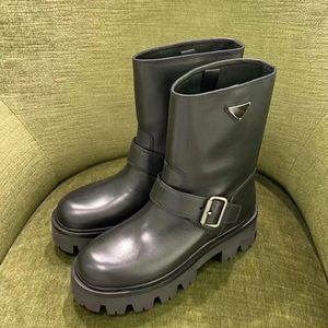 P家普家真皮三角标女靴高跟短靴春秋单靴厚底西部牛仔马丁靴女