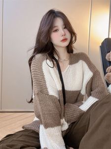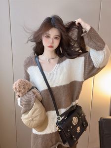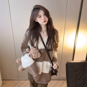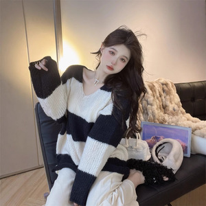 韩版宽松慵懒风V领针织衫女早秋季新款黑白条纹设计软糯套头毛衣