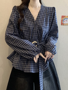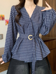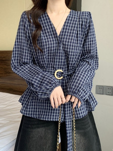 深蓝色格子长袖衬衫女秋装2025新款大码胖mm高级收腰绑带遮肚上衣