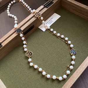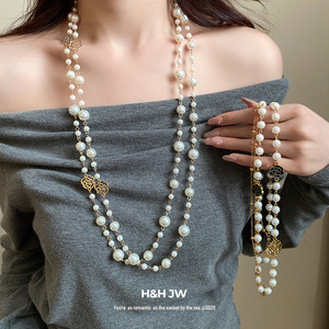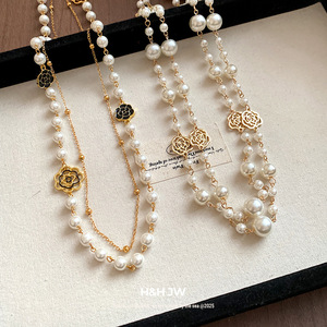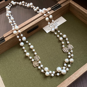 法式镶钻花朵珍珠双层项链复古宫廷风时尚气质毛衣链新款百搭项饰