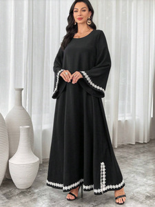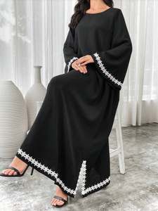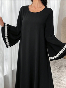 2025穆斯林宽松女性拼接花边喇叭袖宽松简约阿拉伯风格连衣裙长袍