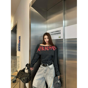 纯棉色织条纹斜肩露肩收腰百搭长袖T恤薄款打底上衣女防晒罩衫
