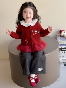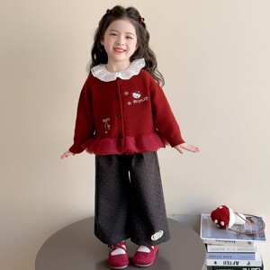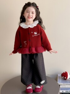 女童韩版套装春秋装2025新款儿童洋气小女孩毛衣开衫波点裤三件套
