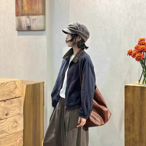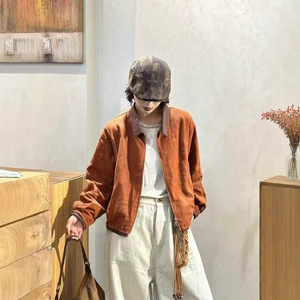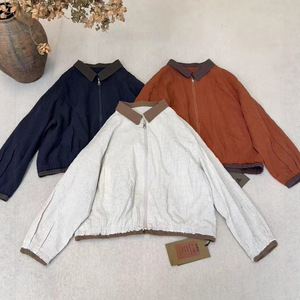 2025秋韩版宽松复古时尚简约亚麻翻领拼色休闲外套百搭上衣女1529