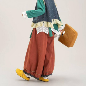2025秋季新款日系文艺撞色百搭撞色木耳花边刺绣荷苞宽松休闲裤