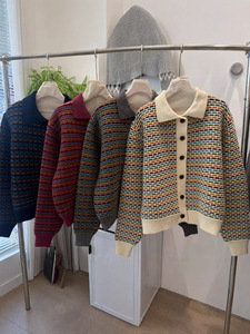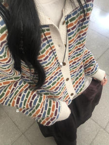 韩国复古彩虹条纹POLO领针织开衫女秋冬新款宽松减龄洋气毛衣外套