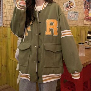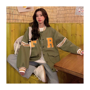 春秋美式棒球服宽松大码爆款小众字母上衣慵懒风毛呢外套女ins潮