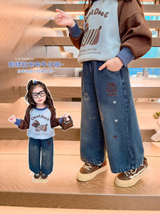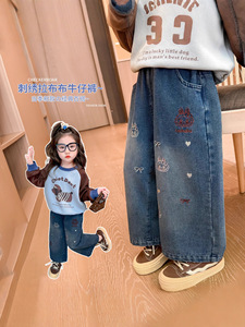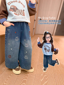 女童刺绣拉布布牛仔裤洋气时髦儿童春秋季新款女宝宝直筒休闲裤子