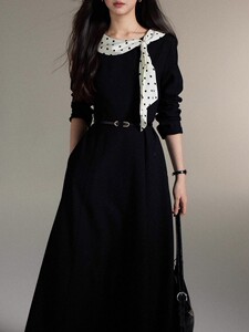 贰羊设计【南艺】法式气质波点飘带领拼黑色连衣裙女高级感收腰裙