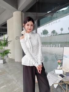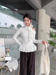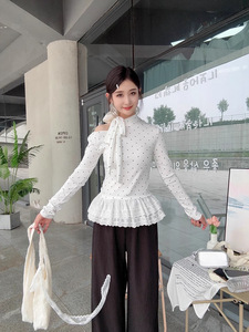 白色波点印花蕾丝下摆斜肩露肩长袖T恤女早秋季温柔甜美修身上衣