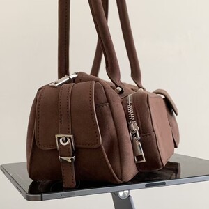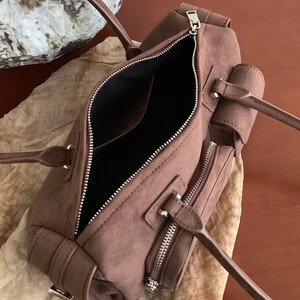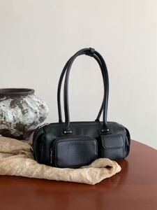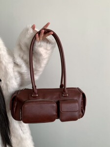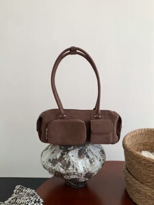 小众麂皮多口袋保龄球包女波士顿包包复古百搭腋下包高级感单肩包