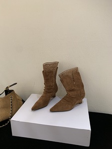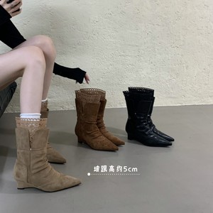 2025年秋冬尖头坡跟显瘦短靴女堆堆靴高跟英伦风中筒靴瘦瘦靴