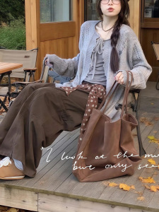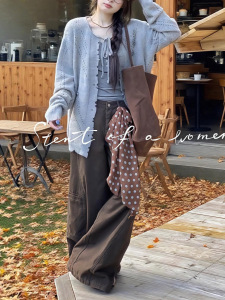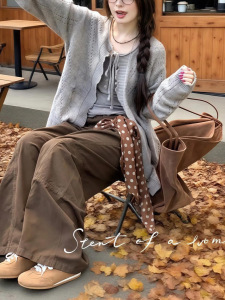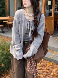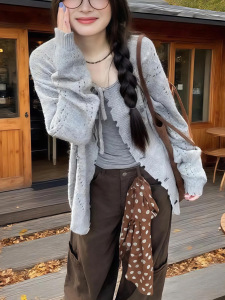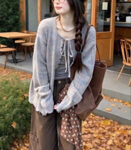 韩系灰色镂空v领针织开衫外套女2025早秋新款chic慵懒风外搭上衣