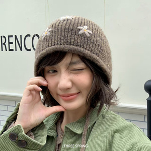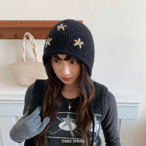批发韩国2025年秋冬新款羊毛混纺花朵刺绣针织帽女韩系ins毛线帽