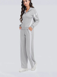 跨境女士两件套休闲服拉链运动套装撞色条纹阔腿慢跑裤旅行运动服