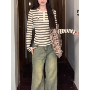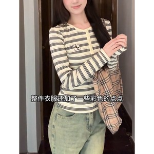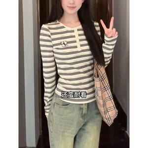 2025秋冬新款时尚百搭条纹正肩长袖t恤打底衫修身显瘦上衣ins现货