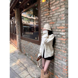 小姐姐白巧恋人仿麂皮外套女春秋米白色设计感机车风宽松夹克