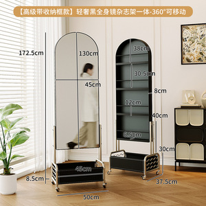 【带收纳框款】轻奢黑全身镜杂志架一体-360°静音万向轮
