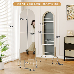 【奶油白】全身镜杂志架一体-360°静音万向轮